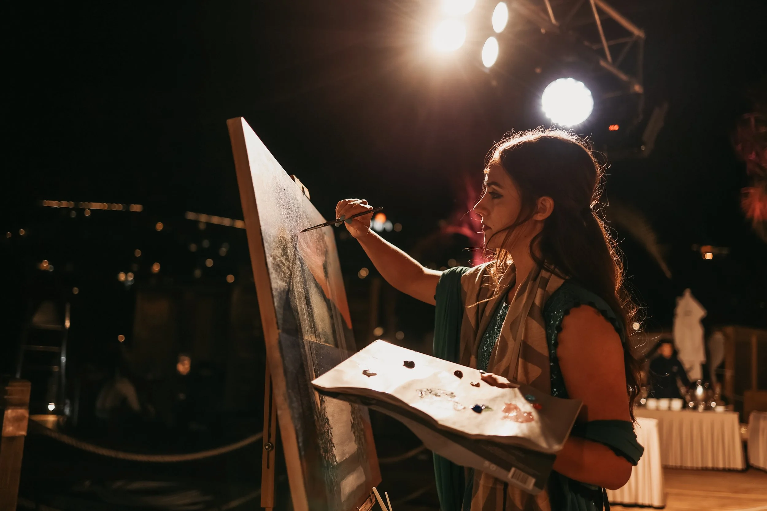 On your wedding day, I arrive early to begin setting the foundation of your painting. As the day unfolds, so does the piece. Guests naturally start to gather, watching it come to life throughout the evening. It becomes a quiet moment of connection—something people are drawn into without it ever feeling like a performance. One of my favorite parts of the night is getting to talk with your guests. I love hearing their stories about you—how they know you, what they admire about your relationship, the memories they’ve shared with you. Those conversations stay with me, and they subtly shape the way I approach your painting as it evolves.