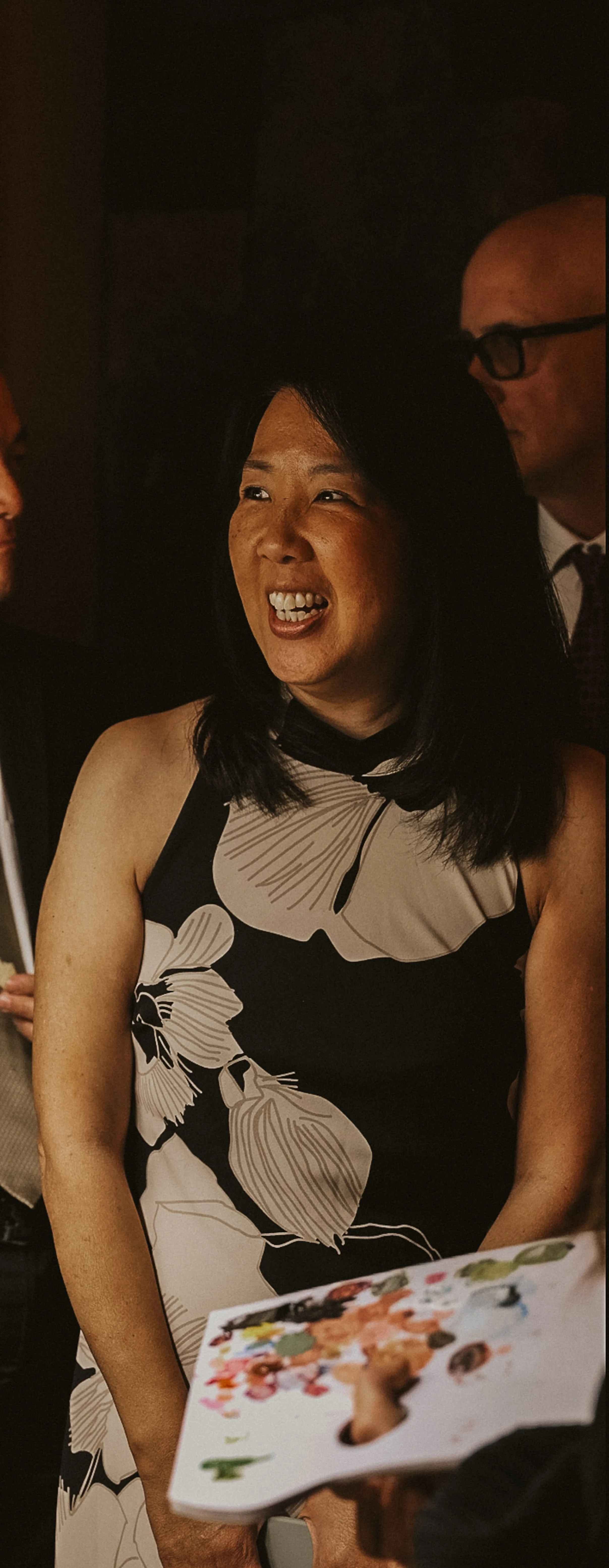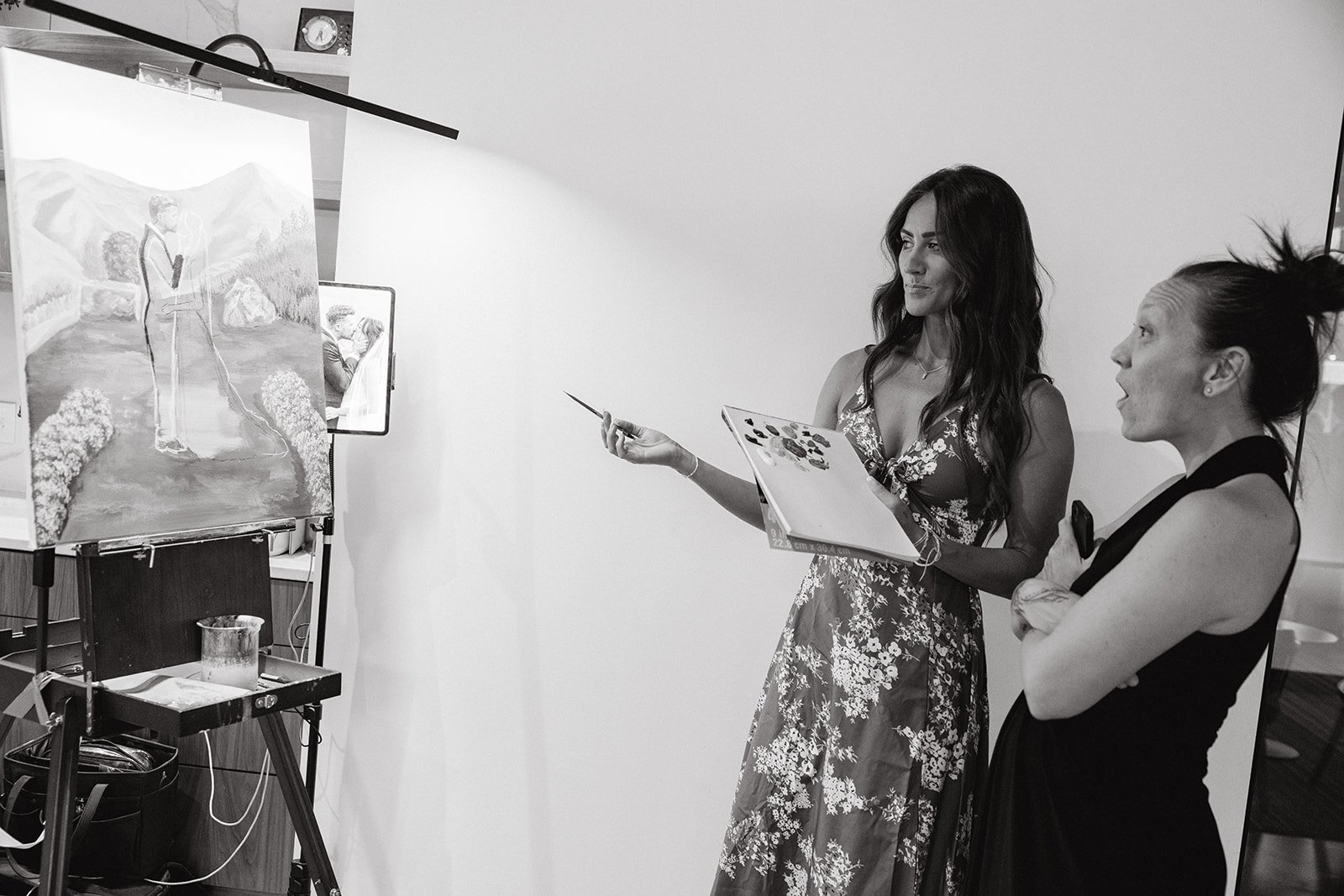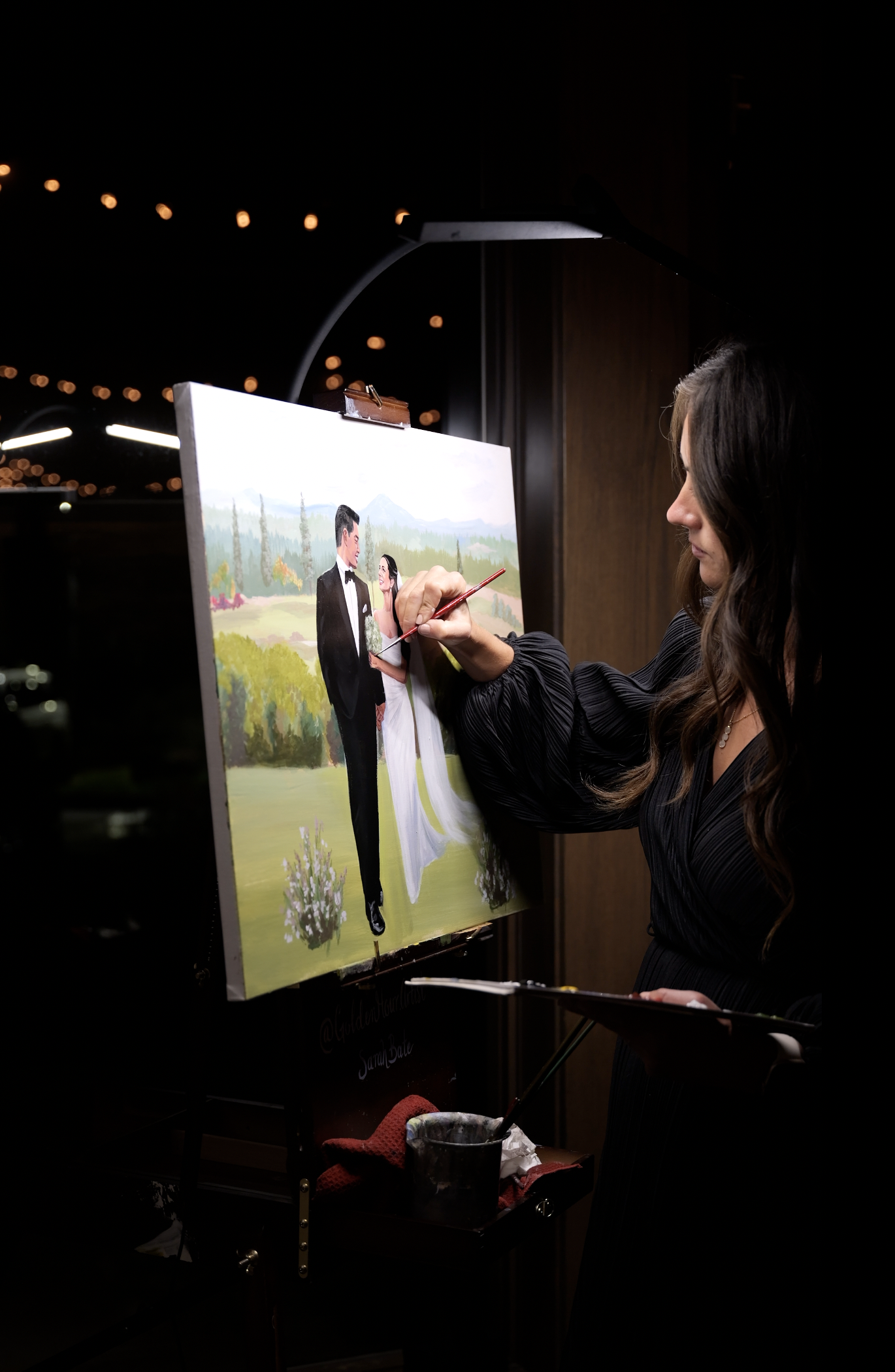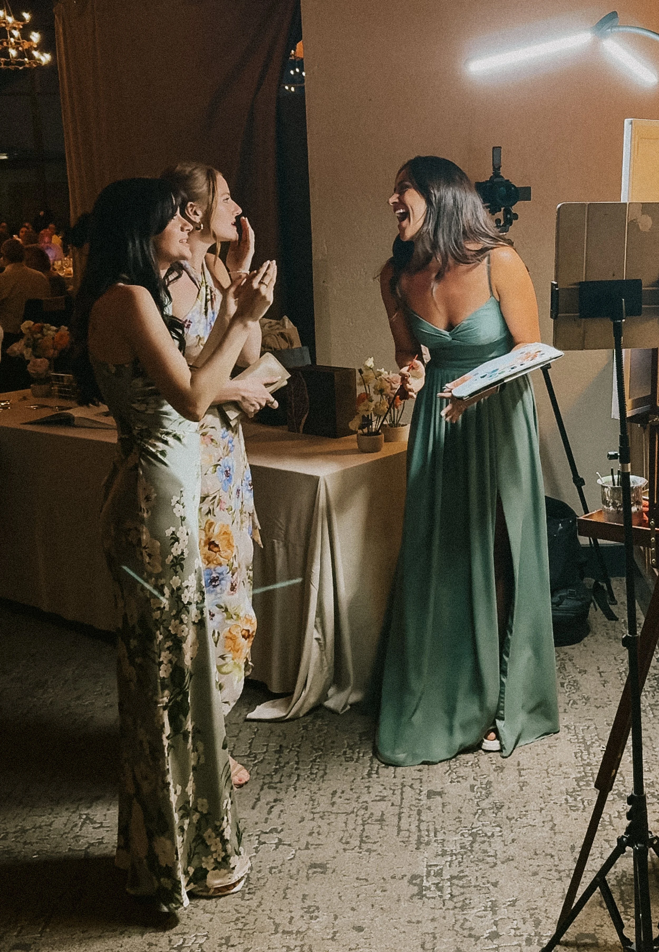 On your wedding day, I arrive early to begin setting the foundation of your painting. As the day unfolds, so does the piece. Guests naturally start to gather, watching it come to life throughout the evening. It becomes a quiet moment of connection—something people are drawn into without it ever feeling like a performance. One of my favorite parts of the night is getting to talk with your guests. I love hearing their stories about you—how they know you, what they admire about your relationship, the memories they’ve shared with you. Those conversations stay with me, and they subtly shape the way I approach your painting as it evolves.